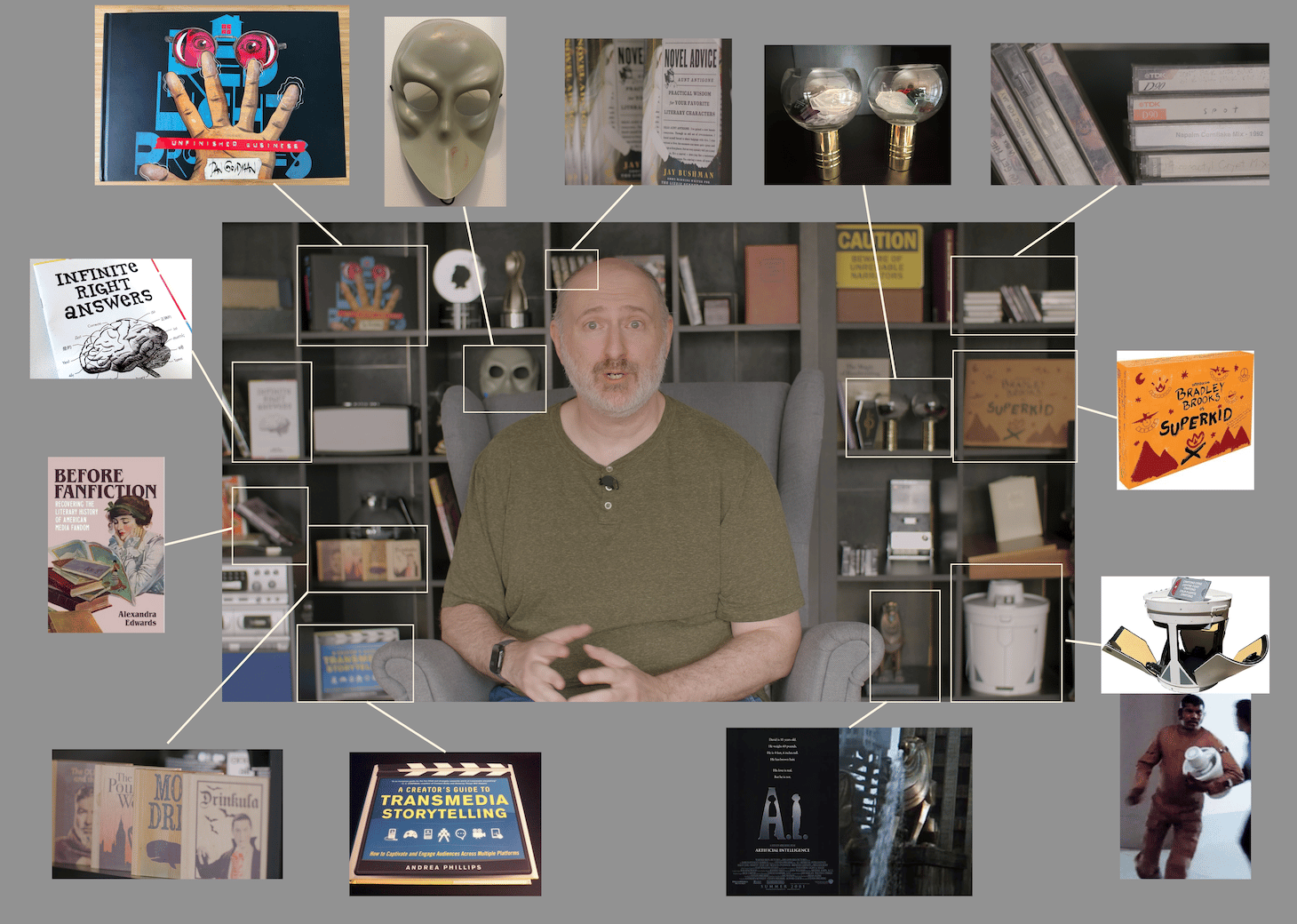 You haven't seen a world like this before. Check it out - and Dan's other works - at his personal studio, Kinjin Storylab. A mask from Sleep No More. With lipstick marks from Hecate. There was before seeing Sleep No More, and after. I first saw it in the fall of 2012 and, like many others, it has informed a lot of my thinking about immsersive ever since. Hiding behind my head, a stack of my 2020 book, Novel Advice. No matter what else I do, I keep coming back to retellings of classic stories. Two Chandrilian chalices from the Star Wars Galactic Starcruiser (it wasn't a hotel!!). After the Halcyon was decommissioned, the glassware started showing up at Galaxy's Edge, and we jumped on the chance to snag a pair. Inside, you'll see piles of New Republic credits, perfect for playing a few hands of Coruscant Shift sabacc. Actual mixtapes from the 90s. Years ago, I rebuilt some of these on a now defunct website called 8Tracks. I might need to make another attempt using a more modern platform. In the meantime, some memories of the Napalm Cornflake - 1992 mix. (Update: Napalm Cornflake on Spotify) The "spot" mix was given to me by a friend in graduate school in North Carolina sometime in the mid-90s, and was named after Data's cat. This tape was my introduction to Tom Waits, Nick Cave, Camper van Beethoven, and Cop Shoot Cop - artists that ended up on heavy rotation for many years afterwards. (Update: spot mix on Spotify) "Camp Calamity" from Hunt A Killer - I was a writer on this play-at-home murder mystery. The experience taught me a lot, and many of those lessons inform SLEEPY HOLLOW, 1998. A camtono. One of the best easter-eggs-that-became-a real-thing. A lion maquette from the production of A.I.: Artificial Intelligence (2001), which, if you've ever talked to me for more than ten minutes, you know is a huge part of my origin story. A Creator's Guide to Transmedia Storytelling by Andrea Phillips My friend Andrea Phillips literally wrote the book on how to do transmedia. And though it came out some time ago, I haven't seen a better guide. Andrea is a wonderful writer in any medium, but her most impressive accompishment is being condemned by NASA for the ARG she wrote for the movie 2012. Literary joke coasters: Drinkula, Moby Drink, The Pour of the Worlds, THe Old Man and the Tea. Get yours here. "Before Fanfiction" by Alexandra Edwards. Alex - or I should say Doctor Edwards - was the Transmedia Editor on The Lizzie Bennet Diaries, where was invaluable in helping me to build and run the interactive architecture of the show. Later, she was the Transmedia Producer on Welcome To Sanditon and Emma Approved. But all of that was a mere distraction from getting her doctorate and expanding the reaches of research into fan studies. "Infinite Right Answers" by Mister & Mischief Zines, they're not just from the nineties! This is from Mister & Mischief - better known as the amazing immersive creators Andy and Jeff Crocker. And it's a burst of inspiration for anybody who's ever struggled with doubt when trying to make something, a mini-festo on creativity, and simply a lot of fun - just like Andy and Jeff are themselves. Thanks for taking a tour through the clutter of my mind. You should see all of the stuff that didn't make it into the shot. Or really, you shouldn't. But please do click on the links and check out the work of my amazing friends. You won't be sorry. |